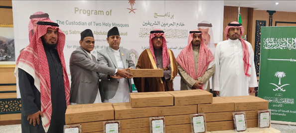 His Excellency Ambassador Fahd bin Mohammed bin Munikhir, in the presence of the Religious Attaché in India, Mr. Bader Al-Anzi, the Head of the Islamic Commission in Nepal, and a number of Islamic figures, launched the Custodian of the Two Holy Mosques Dates and Iftar Program in Nepal. The program is being implemented by the Ministry of Islamic Affairs, Dawah and Guidance in coordination with the Embassy of the Kingdom of Saudi Arabia in Nepal.